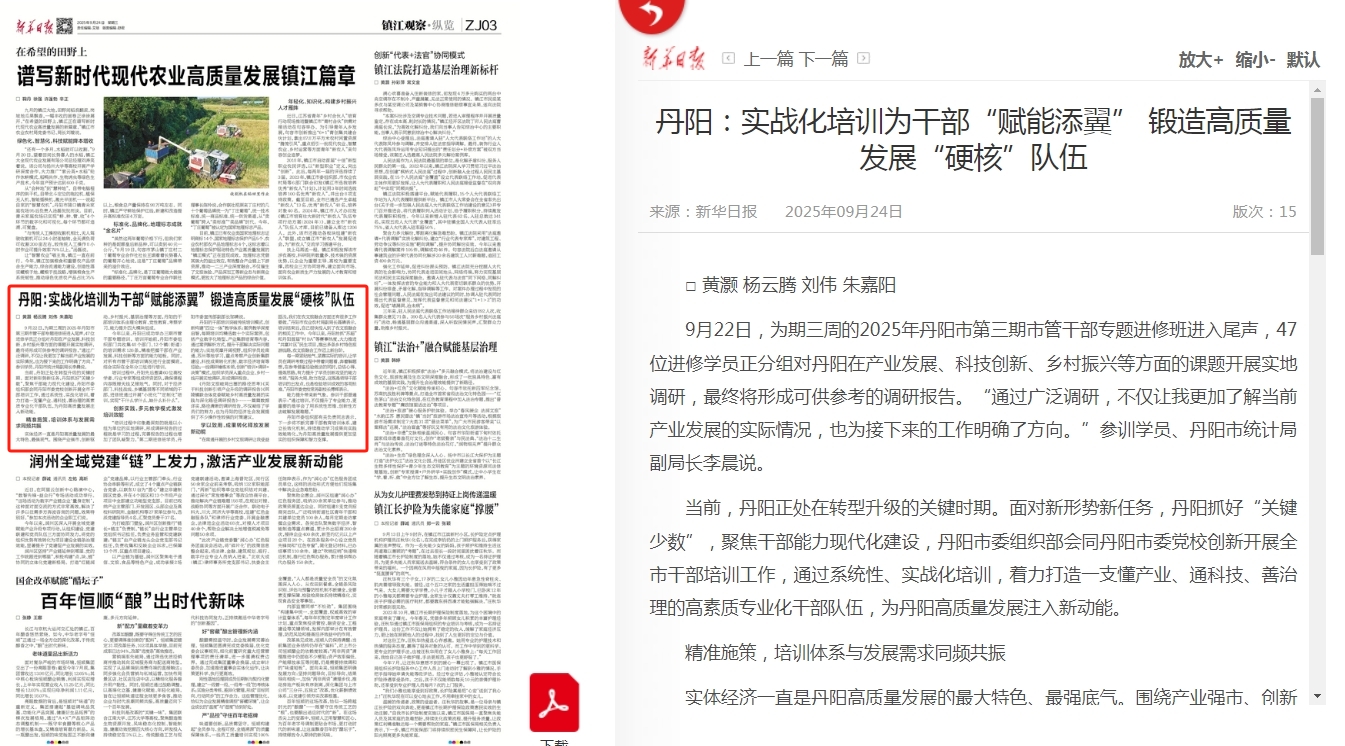 “培训过程中印象最深刻的就是以小组为单位的实地调研,形成调研报告的过程就是学习的过程,完善报告的过程也增加了团队凝聚力。”第二期进修班学员、丹阳市委宣传部副部长邹晴说。丹阳的干部培训突破传统培训模式,创新构建“四位一体”教学体系:案例教学深度启智,每期培训均精选数十个实际案例,包括产业数字化转型、产业集群培育等内容,通过案例解析方式,提升干部解决实际问题的能力;实地观摩开阔视野,组织学员赴南通、苏州等地学习,重点考察产业创新集群建设、科技成果转化机制、数字经济培育等经验;一线调研锤炼本领,创新“培训+调研+决策”模式,组织学员深入重点企业、乡村一线开展实地调研,形成调研报告。《丹阳文旅破局出圈的路径思考》《关于科技创新引领产业升级的调研报告》《珥陵镇联合体党委赋能乡村高质量发展的实践与深化路径调研报告》……一篇篇数据详实、路径清晰的调研报告,不仅凝结了学员们的努力,也为丹阳的经济社会发展提供了不少操作性较强的对策建议。
